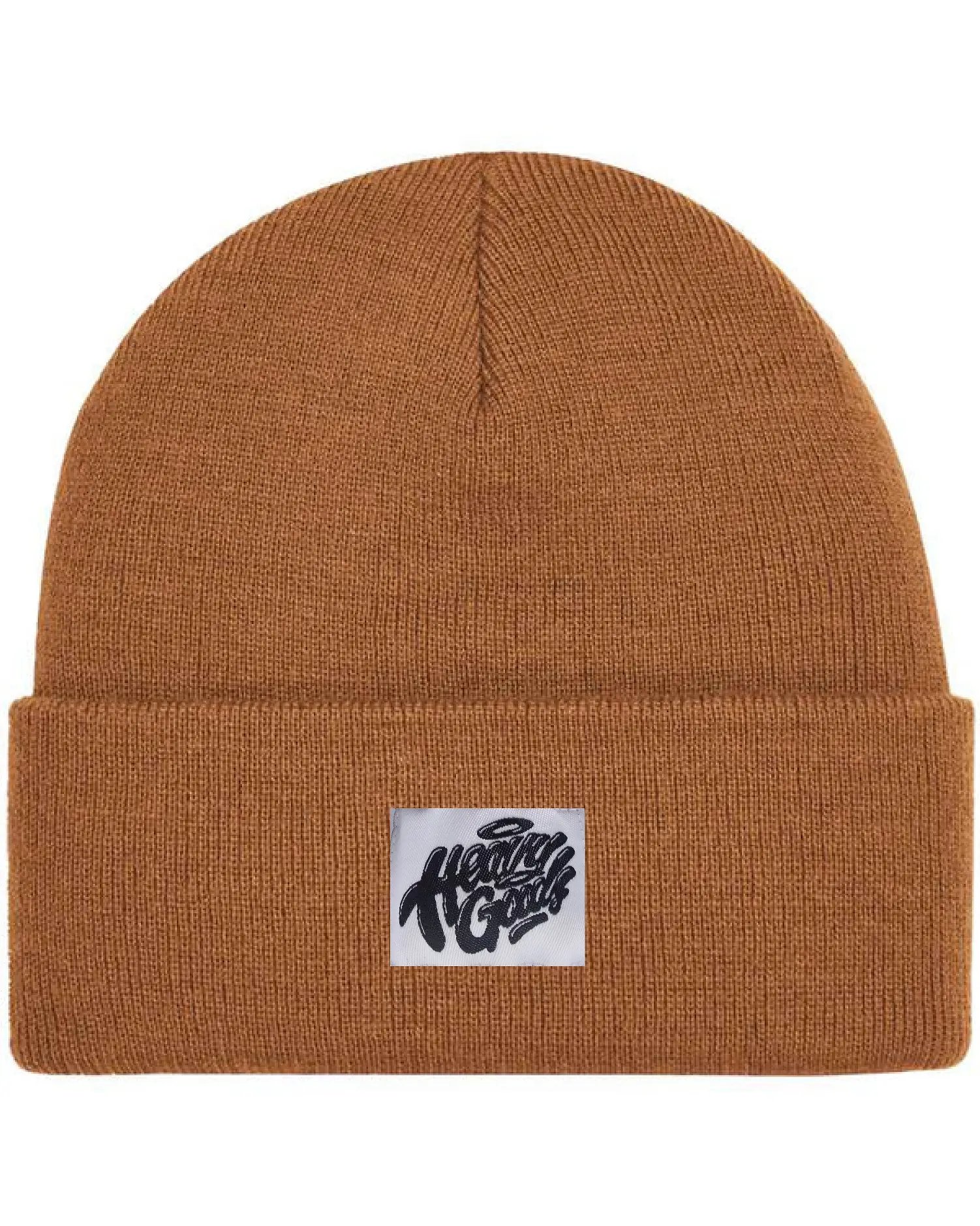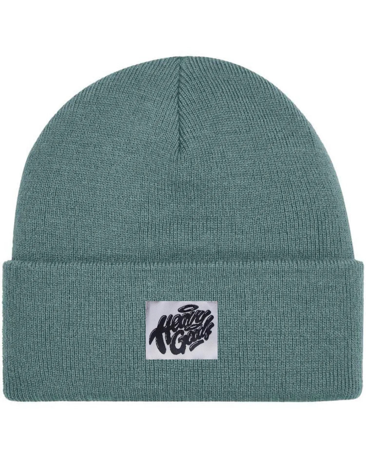 Heavy Goods cuffed beanies available in Marina Green or Pumpkin with Heavy Goods woven label to front cuff.
