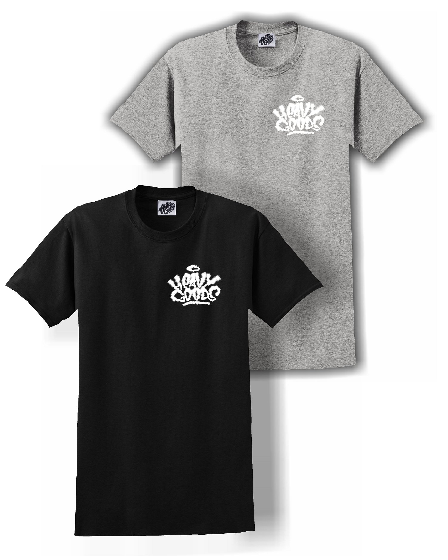 Heavy Goods Extinguisher Handstyle T-Shirts available in Sports Grey or Black with White printed logo to front left chest.