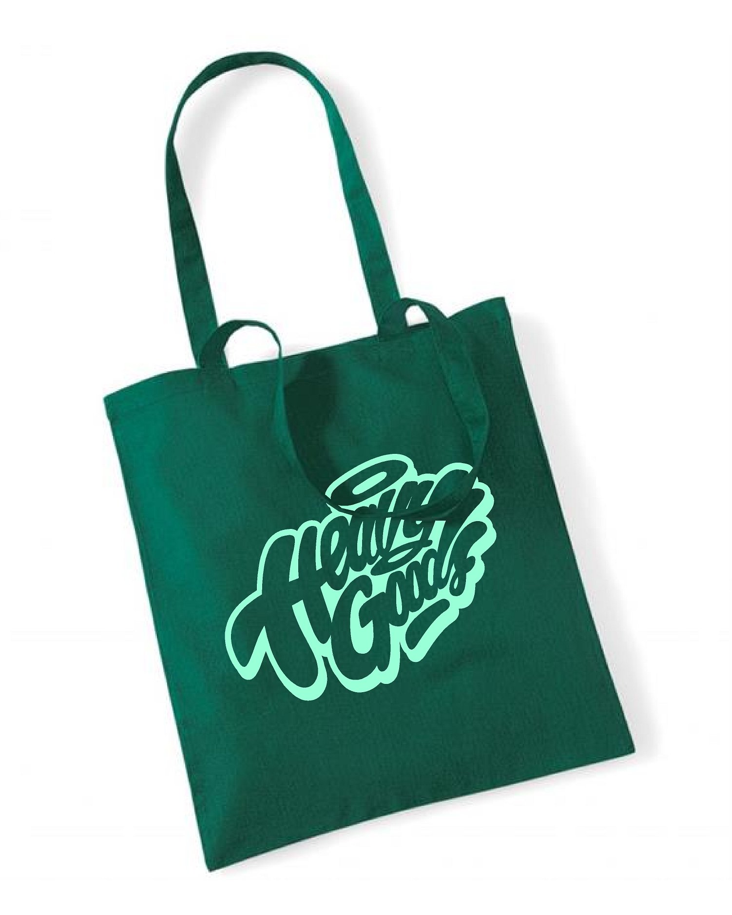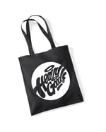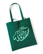 Black tote bag with white logos or bottle green tote with mint green logo.