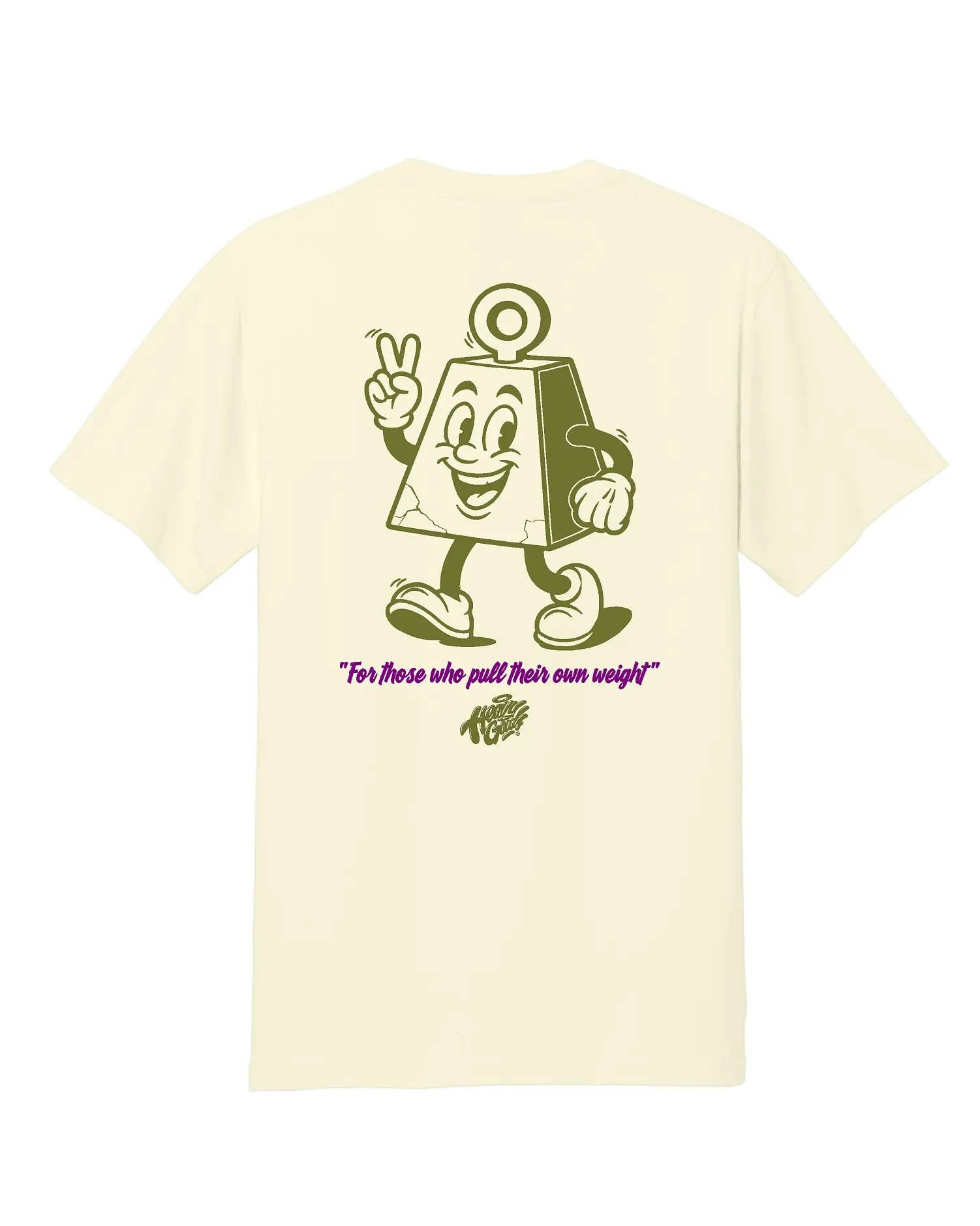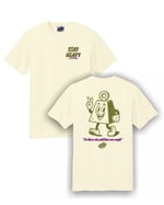 Heavy Goods 'Stay Heavy' T-shirt- off white colour with olive and purple graphic printed to front and back of t-shirt.