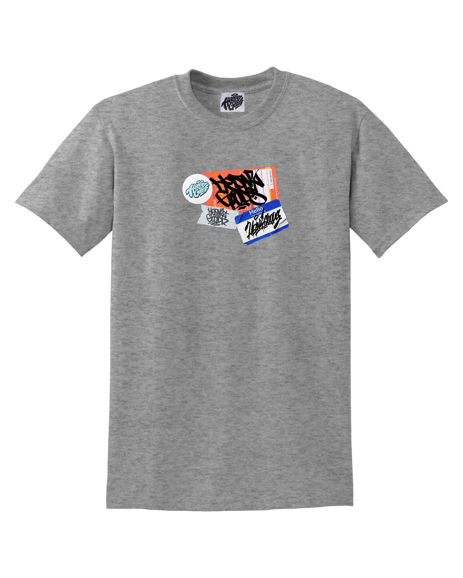Heavy Goods Sticker Logo T-Shirt available in Sports Grey or Black with sticker logo printed to front