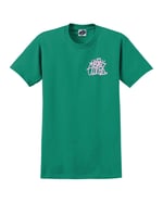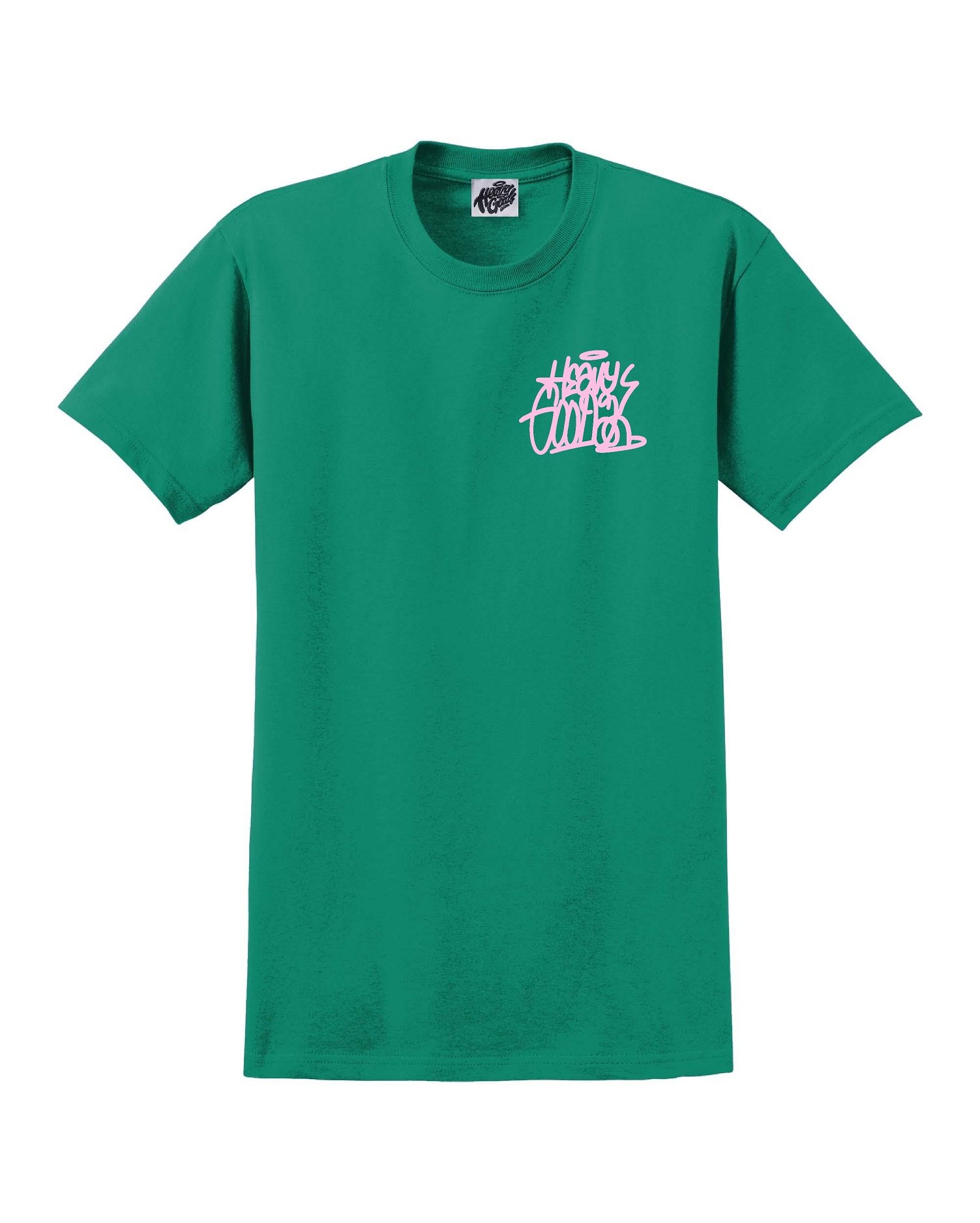 Heavy Goods Collaboration with Eskoh - t-shirt available in 2 colour ways Kelly Green with soft pink print and white with navy blue print.